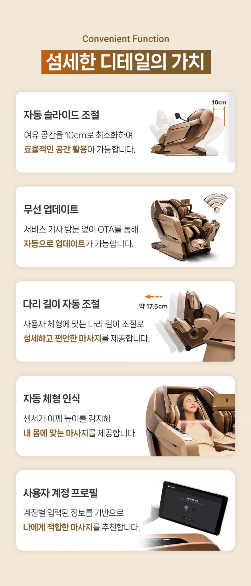 Bodyfriend Quantum 按摩椅专为追求极致放松和健康的您而设计。它集成了 Bang & Olufsen 的音响系统和便于使用的 10 英寸平板电脑控制器,您可以在按摩过程中享受最喜爱的音乐,并轻松控制按摩椅的所有功能。Quantum 按摩椅的设计旨在提供从头到脚的完整按摩体验,同时满足您的需求和偏好。