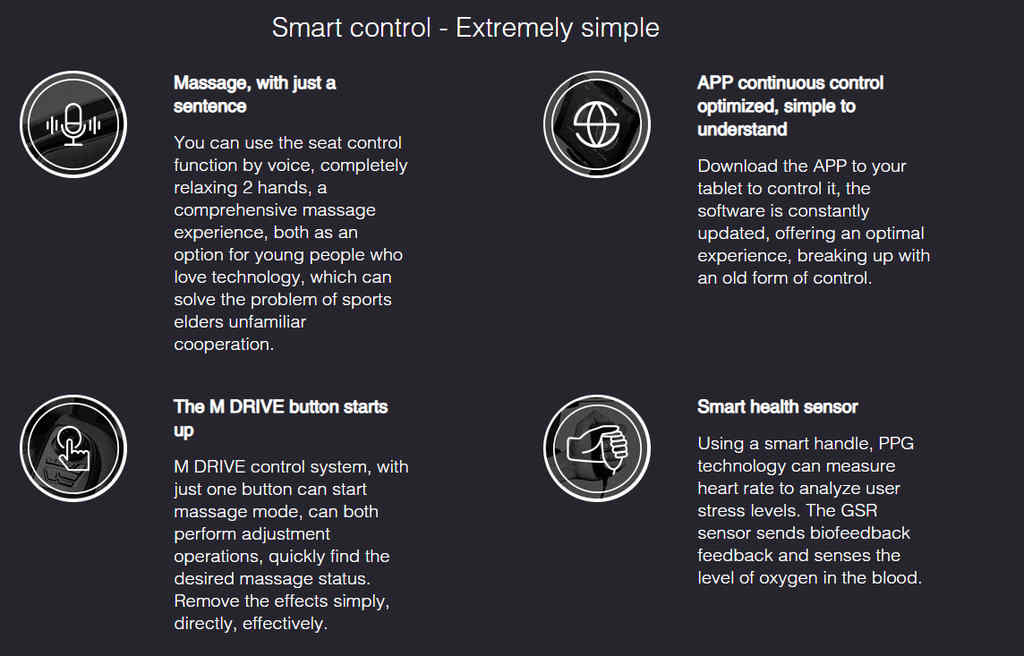 由先进的M.6代微处理器提供动力,Master Drive学习并调整其按摩,改变按摩压力、速度和动作,以完美地适应每个独特的身体轮廓,并配有智能Vario Motion 4D按摩滚轮。